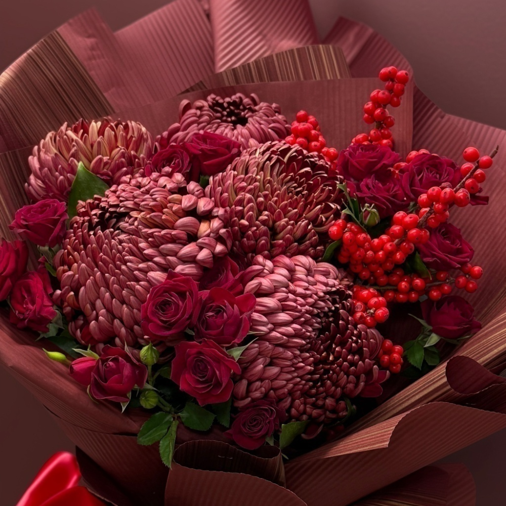 Роскошный букет, сочетающий бордовые хризантемы, насыщенные красные розы и яркие гроздья ягод, оформлен в стильной бордовой упаковке — воплощение элегантности и страсти.